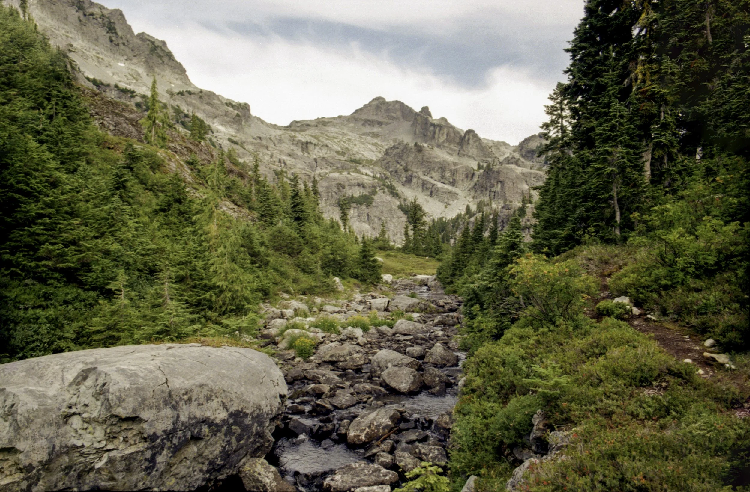 A mountainous landscape with a rocky stream running through a lush green forest, with high rocky peaks in the background and cloudy sky overhead.